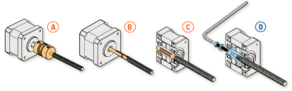 將電機固定到梯形絲杠上通常需要耦合器總成 (A)、沉孔壓配合 (B) 或空心軸壓配合 (C)。 組裝流程可能還需要使用 粘合劑或焊接,但結(jié)果就是所有這些解決方案將造成難以或無法更換梯形絲杠 或進行維護。 通過正在申請專利并只需要一個固位緊固件的錐形鎖套耦合器 (D),Thomson 已成功解決這一問題。 您可利用這項全新設計輕松進行維護或梯形絲杠的更換。