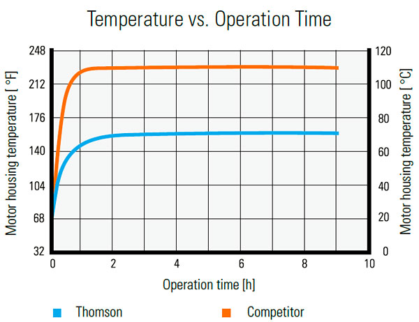 由于 Thomson 的電機效率更高,因此可在更低熱損耗的條件下輸出更多扭矩,這意味著我們的電機可在更高的輸入功率下運行,同時減少熱量產(chǎn)生。