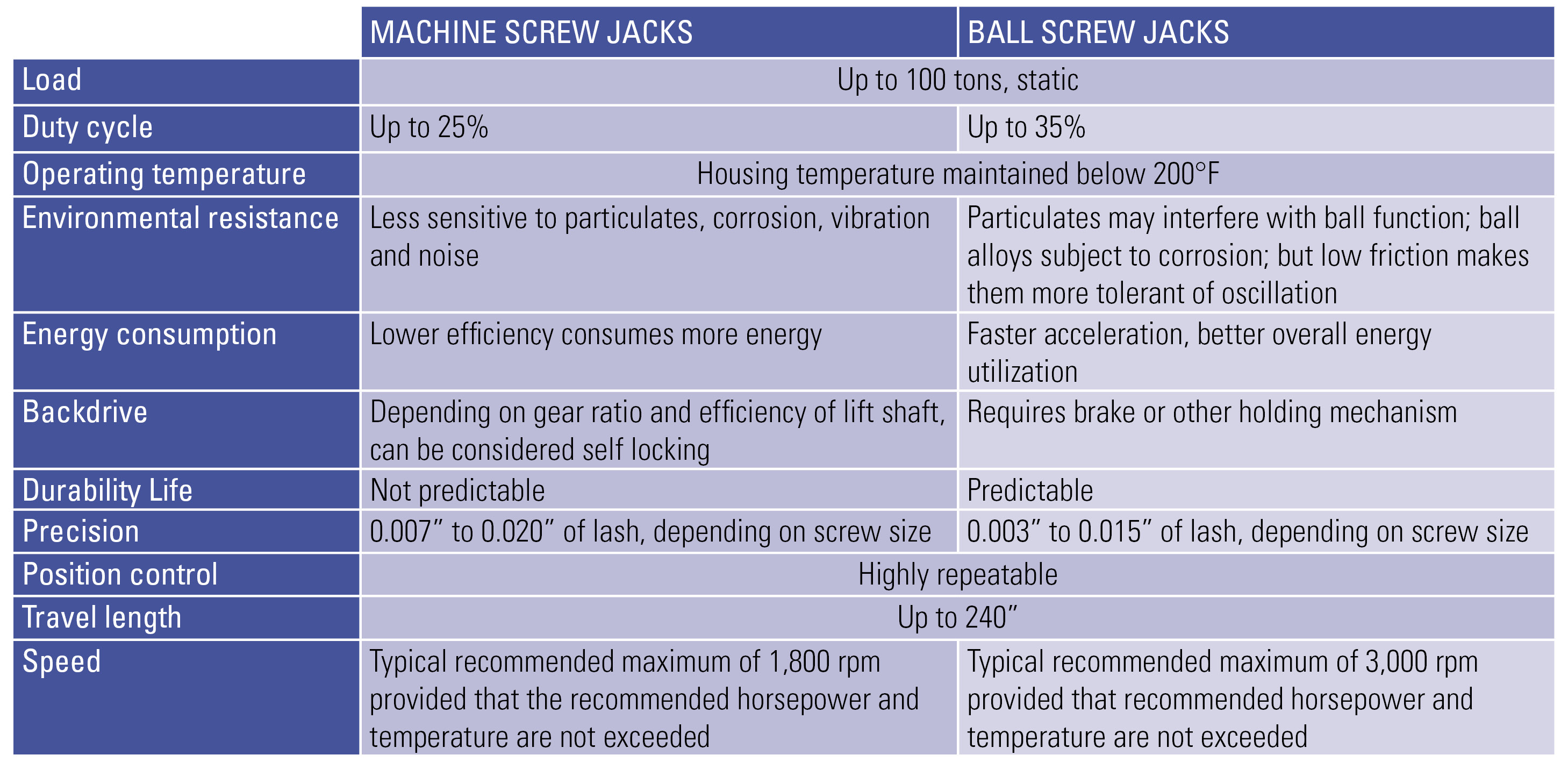 Within those broad parameters, however, there are many other factors that could affect the decision. Machine screw jacks are more resistant to airborne particulates and corrosive chemicals, are quieter and have minimal backlash. Ball screw jacks, on the other hand, have more predictable lifecycles. Whether the machine screw jack or ball screw jack is right for you will, of course, depend on your application parameters. No matter which screw jack you choose, their increased control, tremendous power, easier installation and environmental friendliness will instill confidence in your motion system design.